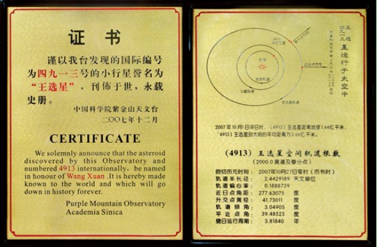 2008年1月31日,經(jīng)國(guó)際小行星中心和國(guó)際小行星命名委員會(huì)批準(zhǔn),國(guó)際編號(hào)為4913號(hào)小行星,正式命名為“王選星”。