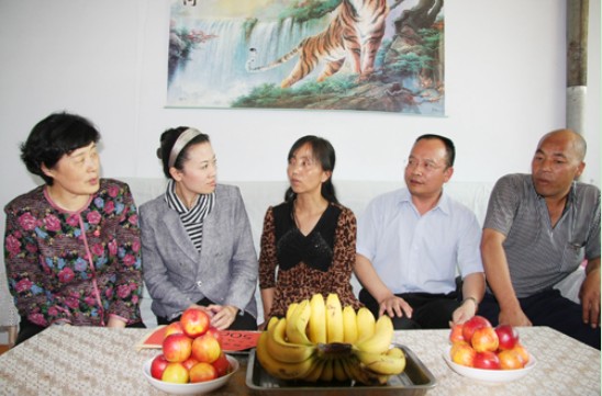 中國(guó)婦女發(fā)展基金會(huì)副秘書(shū)長(zhǎng)朱錫生(右二)、青海省婦聯(lián)副主席謝瓊(左一)、方正集團(tuán)副總裁兼首席品牌官魏亞歐(左二)一同看望郭玉蓮夫婦。郭玉蓮(中),樂(lè)都縣碾伯鎮(zhèn)土橋村宮頸癌患者。出院以來(lái),身體素質(zhì)和精神恢復(fù)情況尚可,但目前無(wú)法正常從事體力勞動(dòng)。